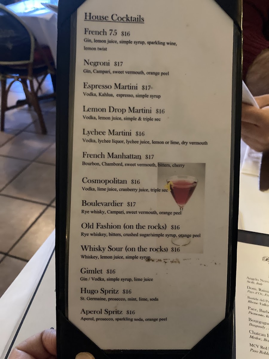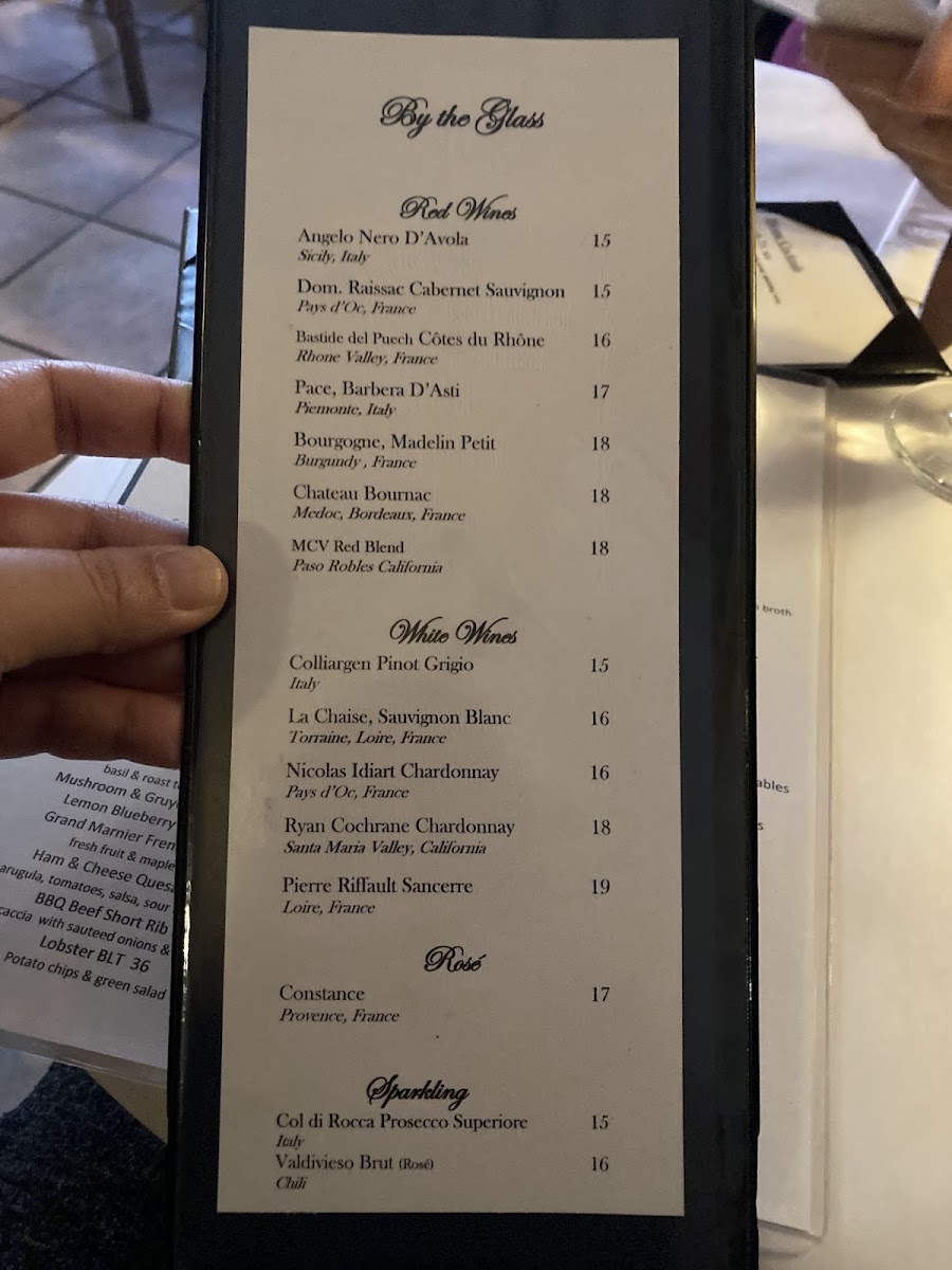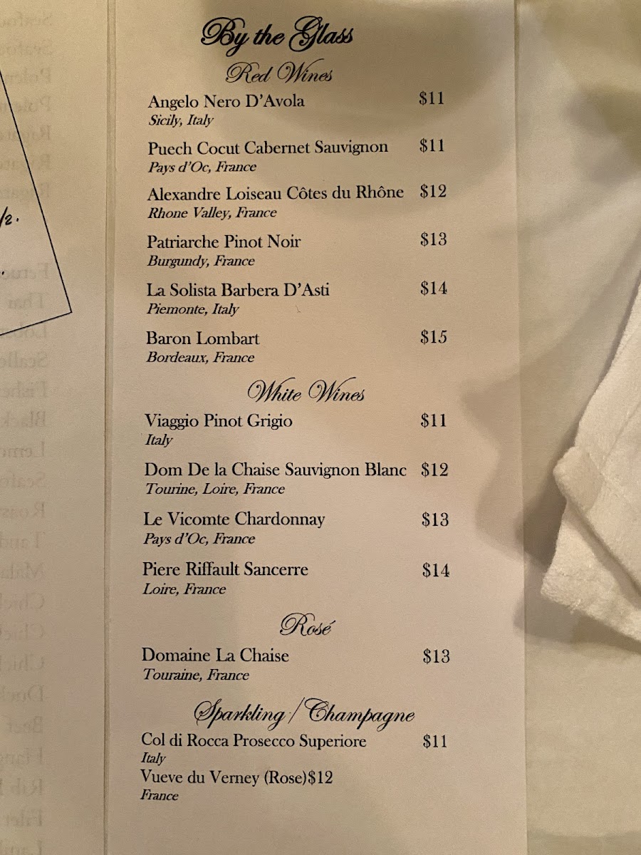 The drinks menu includes a nice selection of beers, such as Allagash White, Kronenbourg, and Sierra Nevada, offering a nice variety for those looking to pair their meal with a cold brew.