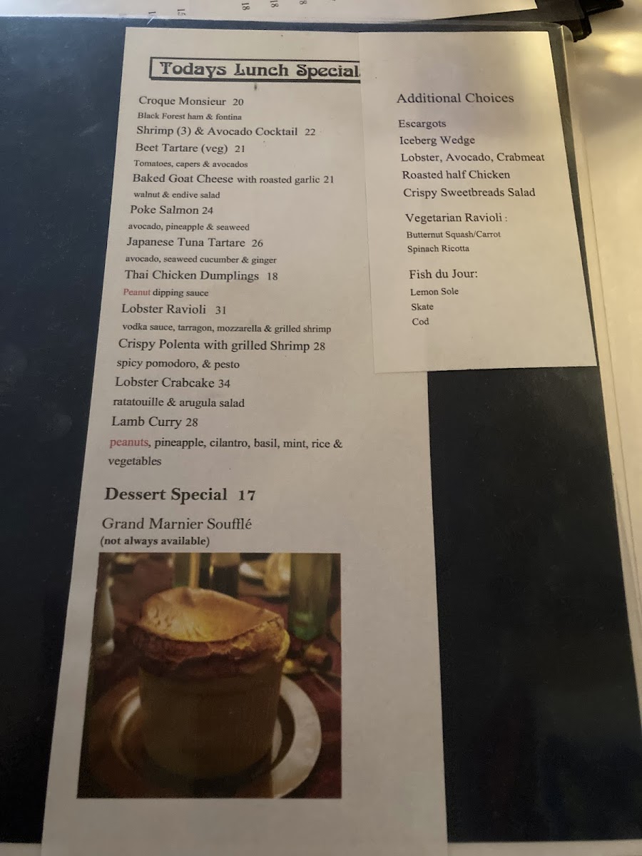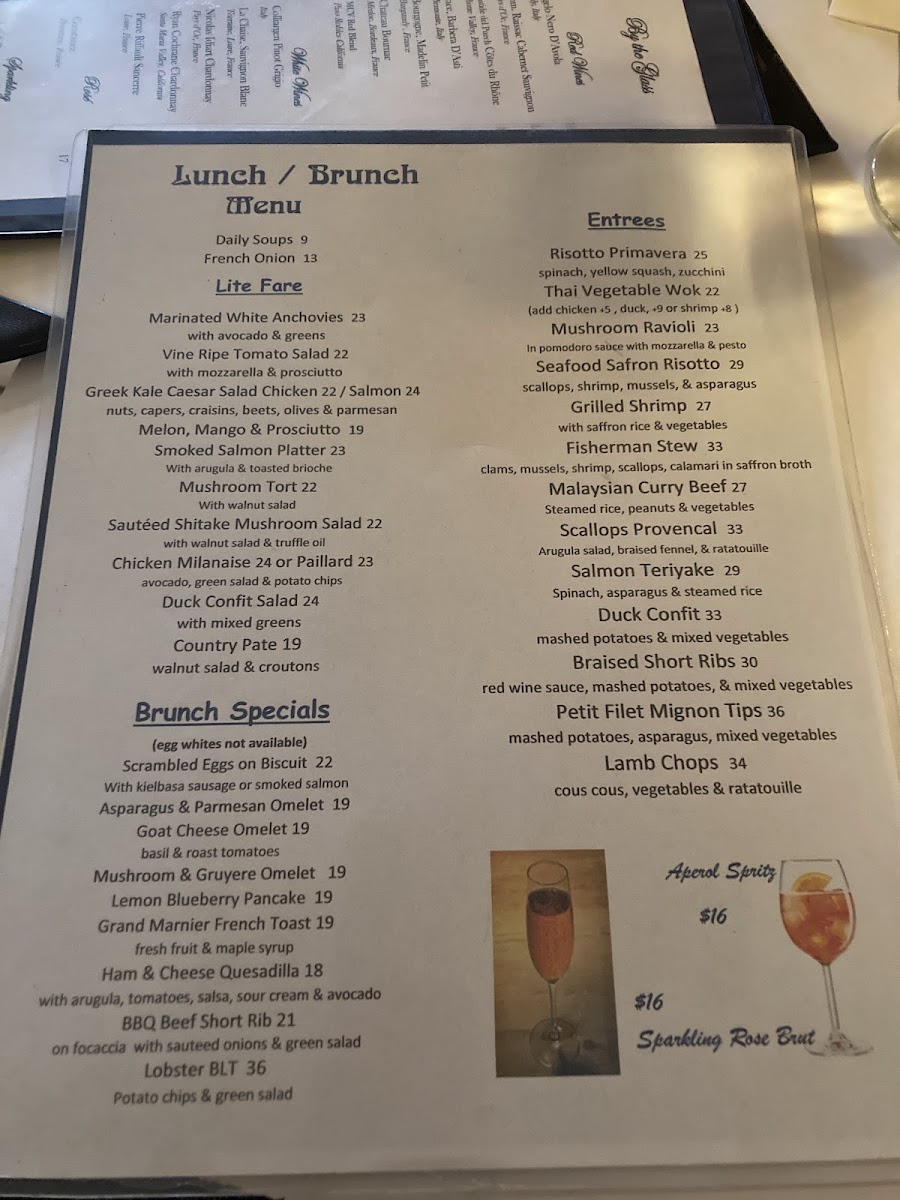 The entrees section features elevated dishes that will impress any diner. Scallops Provençal brings the delicate flavors of the sea to the table, while the Lamb Tajine offers a tantalizing, spiced dish. For those craving something more indulgent, the Baby Back Ribs and Hanger Steak are sure to satisfy. If you’re looking for something lighter yet equally flavorful, the Thai Vegetable Wok is an excellent choice, with vibrant vegetables and bold seasoning.