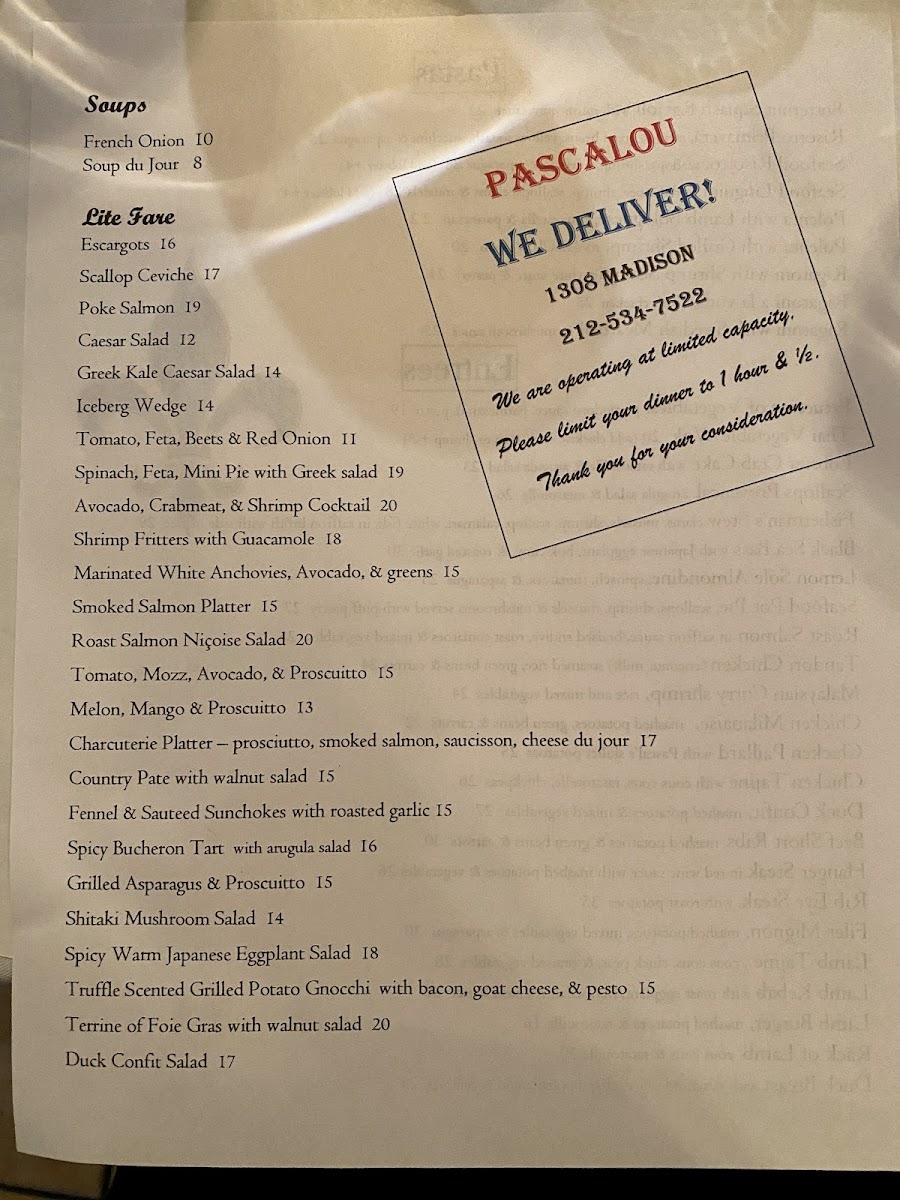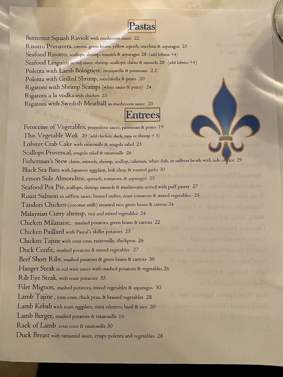 Overall, Pascalou's menu is a beautiful blend of classic French and Mediterranean-inspired dishes, offering something for everyone. Whether you're in the mood for a substantial entrée or a light salad, each dish is thoughtfully crafted with quality ingredients and a focus on delicious, satisfying flavors.
